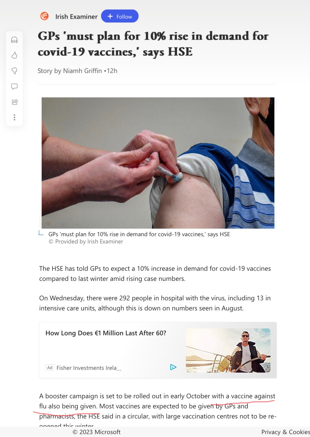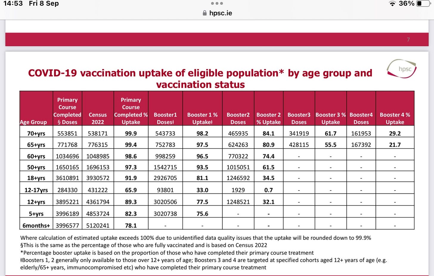 Does anyone seriously think that the percentages that fell away after getting the Primary dose in 2021 are going to return in September 2023 for a jab that the Irish Times says “the hope is that it will offer some protection against serious illness and hospitalisation”?