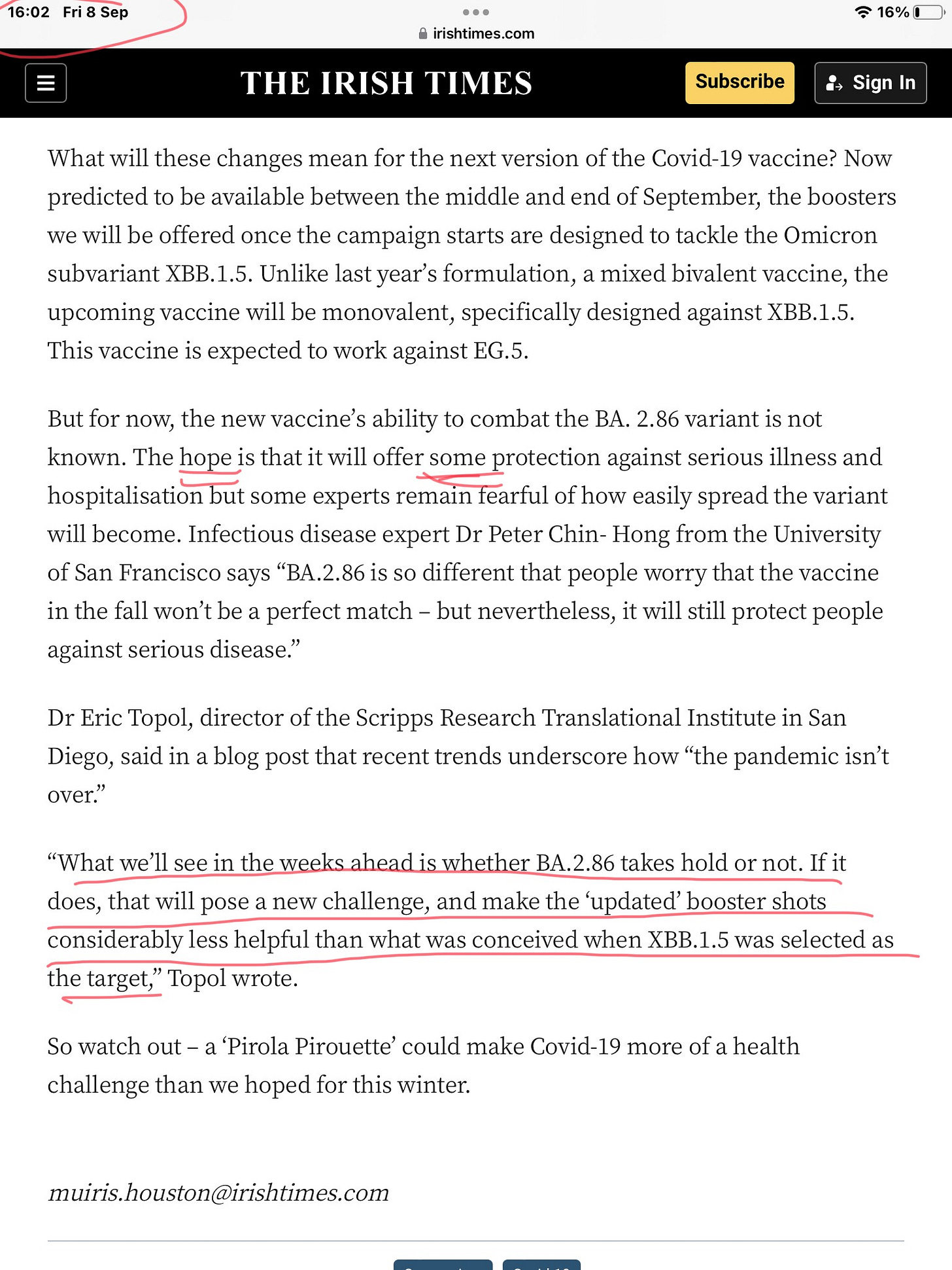 The Irish Times also has the caveat that if the ‘BA.2.86’ variant takes hold then it ‘will pose a new challenge and make the updated booster shots considerably less helpful than what was conceived when ‘XBB.1.5’ was selected as the target’.