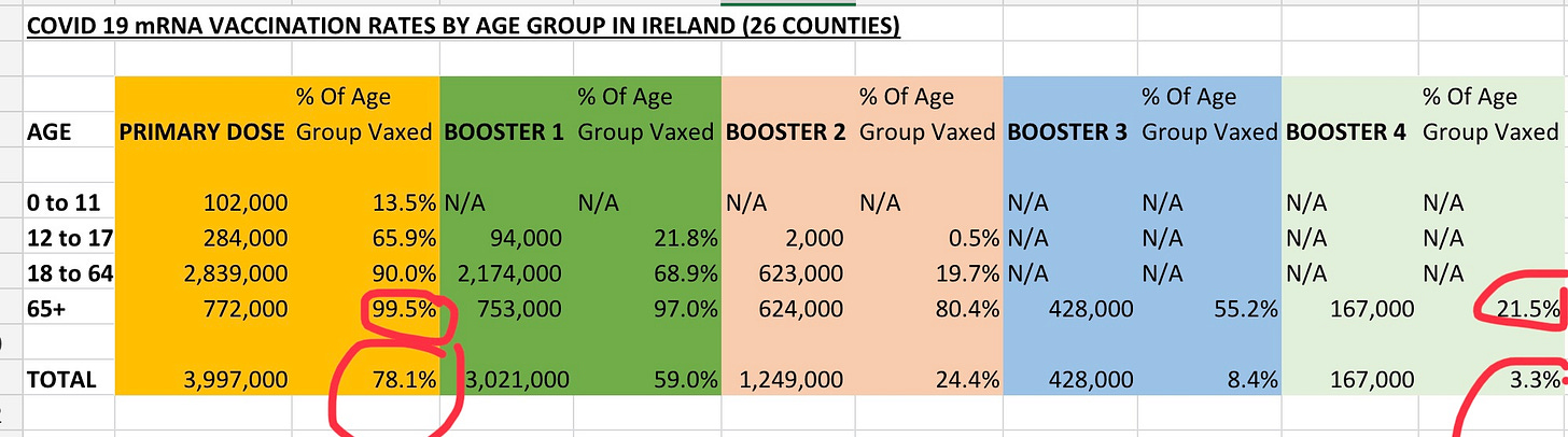 Let’s examine the official vaccine figures for ‘Primary’ doses to Booster number 4 per the hpsc.ie website as per June 2023.